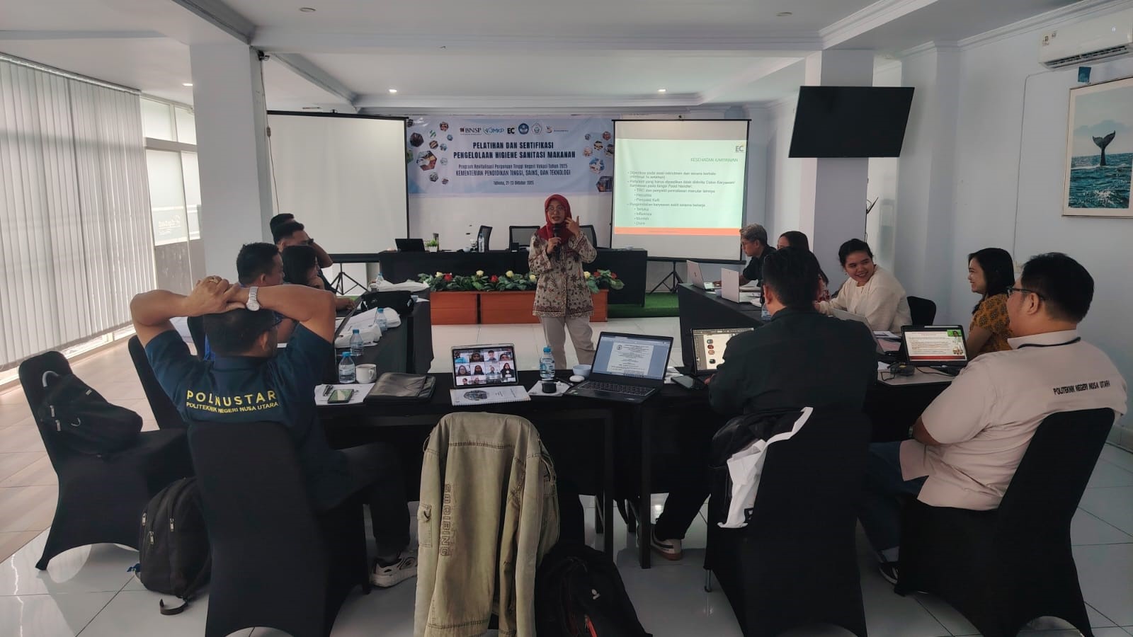 Untuk memastikan pendampingan yang dilakukan oleh dosen memiliki standar kompetensi yang tinggi, POLNUSTAR kemudian menyelenggarakan Pelatihan dan Sertifikasi Kompetensi Dosen di Bidang Pengelolaan Higiene Sanitasi Makanan pada 21-22 Oktober 2025. Sertifikasi ini melengkapi kompetensi yang telah dimiliki para dosen di bidang Cara Produksi Pangan Olahan yang Baik (CPPOB) dan Hazard Analysis Critical Control Point (HACCP). Dengan bekal ini, dosen-dosen POLNUSTAR semakin siap mendampingi UMKM dalam memproduksi pangan yang aman, bermutu, dan berdaya saing.